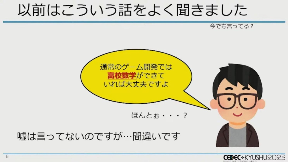 ゲーム開発者向けのカンファレンス「CEDEC+KYUSHU 2023」が、2023年11月25日(土)に開催されました。本記事は、ゲームプログラマを目指す高校生や専門学校生に向け、ゲームに活用されている数学的知識が実例とともに解説されたセッ...